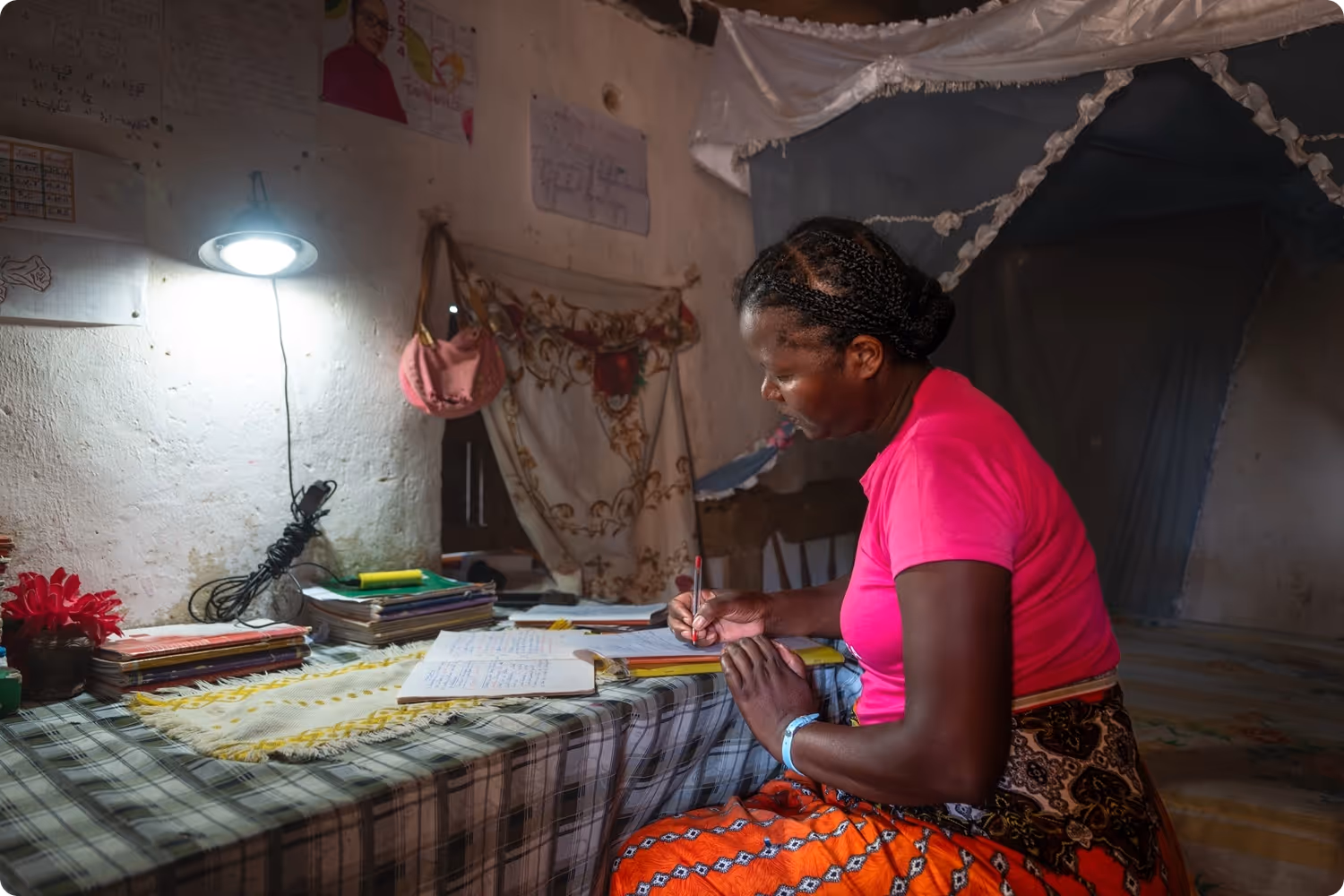 In 2022, Marie received her first solar lamp through the Light Library project. The change was immediate. For the first time, she had a bright, clean source of light that allowed her to prepare lessons comfortably. She designated one room in her home as a study space where she could plan, read, and write clearly each evening.